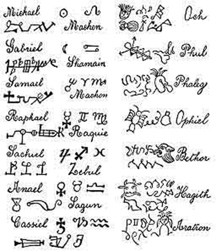 This is a comparison of the information we have compiled thus far: the upper row are the archangels, beneath that the linear and linear/curved sigils symbolising the number squares' kamea, beneath these the seven planets in twelve "positions," and beneath that the name of the spirit and demon beneath the archangels who are, in turn, over the legions of spirits and demons.